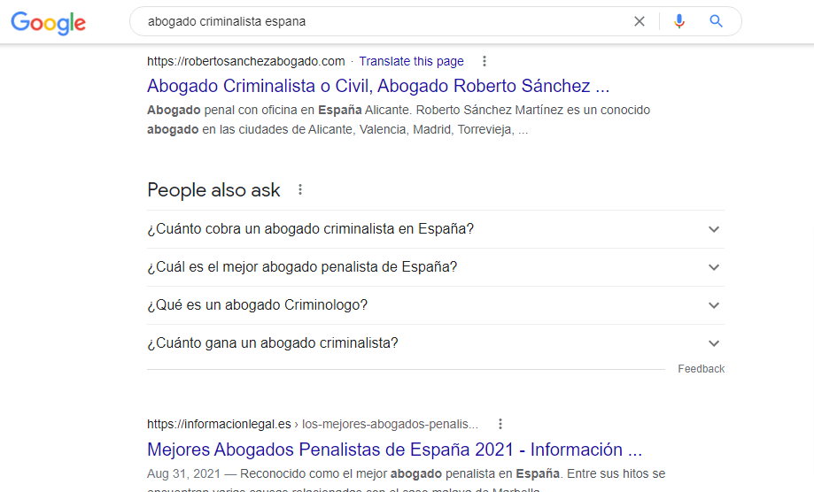 Exemplu: Din dorința antreprenorului care a sugerat cuvintele cheie… aferente afaceri sale, în imaginea de mai jos se poate observa locul din Google câștigat de Weryon pentru avocații spanioli.