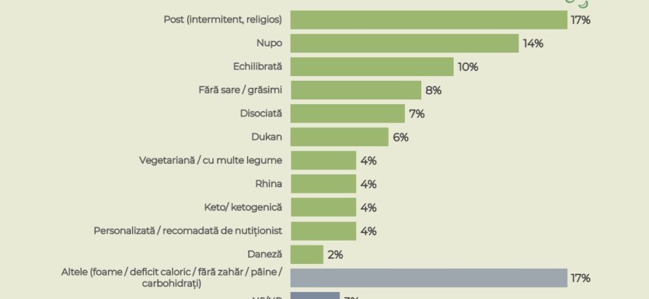 Sondajul indică o creștere semnificativă a aderării la regimuri alimentare echilibrate nutrițional, astfel că în anul 2023, 17% dintre români au declarat că au ținut dietă, iar ca opțiuni au preferat postul / intermitent sau religios (17%) și dieta Nupo (14%). Alte diete menționate sunt: regim echilibrat (10%); fără sare, grăsimi (8%); Dukan (6%), vegetariană/ cu multe legume (4%); Rina (4%), ketogenică (4%); personalizată/recomandată de nutriționist (4%); daneză (2%). În același timp, 17% dintre persoanele participante la studiu au avut răspunsuri legate de foame / deficit caloric / fără zahăr / pâine / carbohidrați.