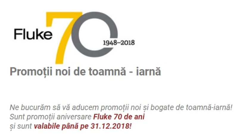Ronexprim desfasoara, in urmatoarea perioada, mai multe promotii la instrumente de masura de la Fluke, cu ocazia implinirii a 70 de ani de activitate a furnizorului american de echipamente. Promotiile de toamna-iarna se desfasoara pana la finalul anului si includ unele dintre cele mai apreciate produse din oferta partenerului traditional al Ronexprim, de la multimetre digitale si testere electrice pana la clesti de curent.