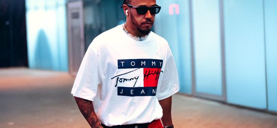 În ziua cursei, Lewis a intrat în paddock purtând un tricou clasic TOMMY JEANS cu steagul logo și o pereche de blugi inspirați din anii ’90, în culorile albastru și roșu, personalizați cu numele „Tommy” și „Lewis” pe fiecare latură a pantalonului.
