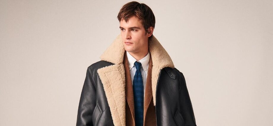 Look 4: O jachetă aviator din piele de oaie conferă un plus de modernitate ținutelor relaxate, purtată peste un costum călduros de culoare camel, cu o cămașă albă Oxford și o cravată din mătase jacquard bleumarin. Combinația dintre textura tradițională și stilul elegant, potrivit pentru mediul urban, surprinde abordarea newyorkeză a colecției în ceea ce privește rafinamentul ținutelor casual.